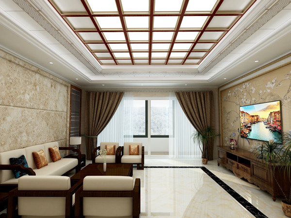 客廳吊頂:誰說新中式一定是老氣繁復的,“御-品”給你帶來不一樣的新中式,從基礎性、普遍性去探究它給我們帶來的視覺感受,從而形成一種輕松的生活氛圍,原來新中式的簡約美可以這樣去詮釋。
